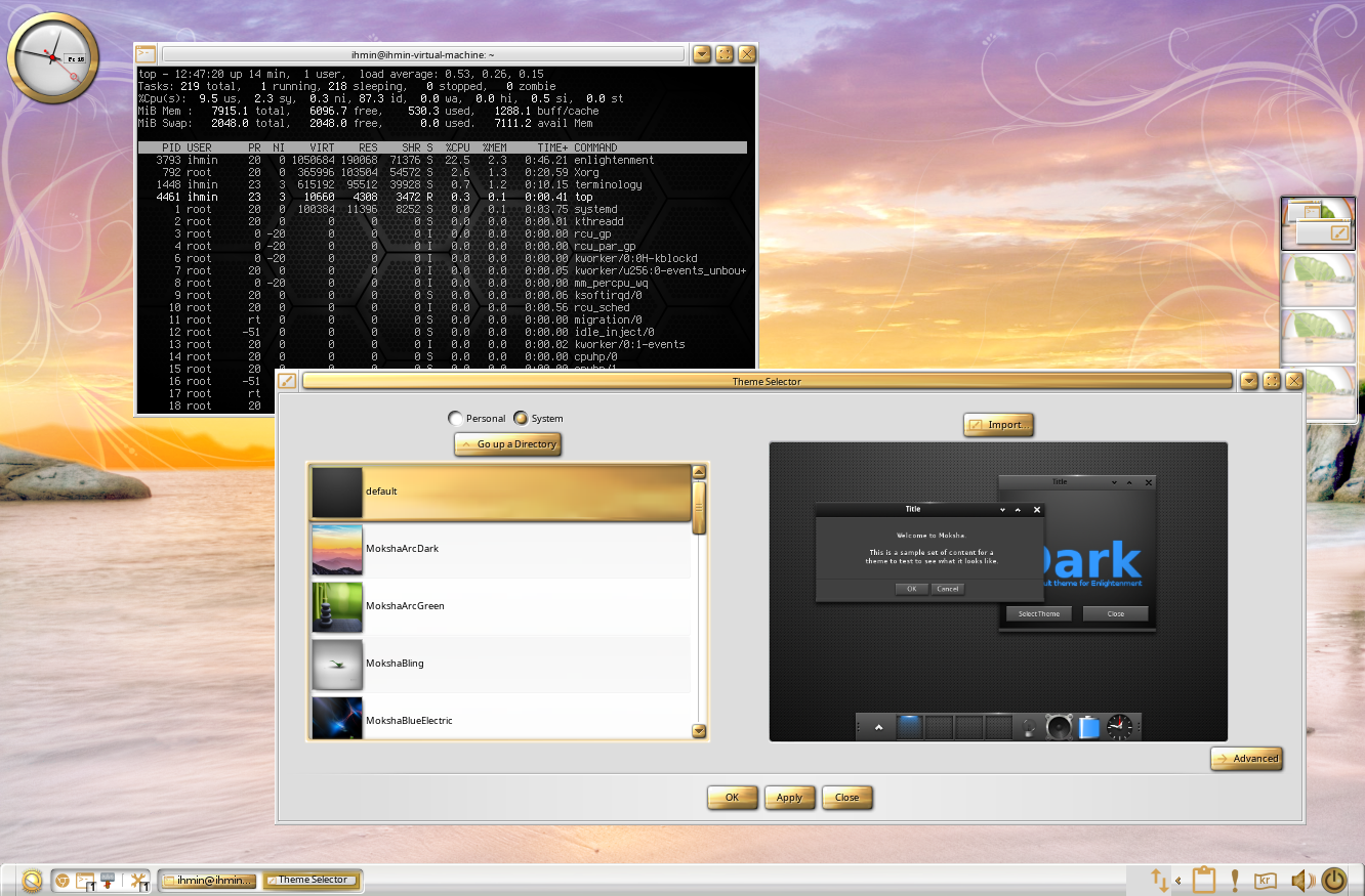 Enlightenment desktop 을 포크한 Moksha desktop 과 우분투 22.04 LTS를 기반으로 한 Bodhi Linux 7.0 버전을 설치하고 스샷을 찍어봄..