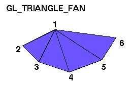 GL_TRIANGLE_FAN은 GL_TRIANGLE_STRIP과 비슷하지만 이전 삼각형의 두 점을 재 사용하는 것이 아니라 항상 첫 삼각형의 시작 정점 한 개와 이전 삼각형의 마지막 정점을 재사용합니다. 예를 들어 v1, v2, v3 로 삼각형을 그린 후 새로운 정점 v4를 추가하면 v1, v3, v4로 삼각형이 그려집니다. 여기에 다시 v5를 추가하면 v1, v4, v5로 삼각형이 그려집니다.