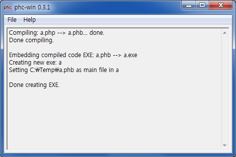 File -> Compile single file 메뉴를 누른 후 php 스크립트를 지정해 주면 실행파일이 생성됨.