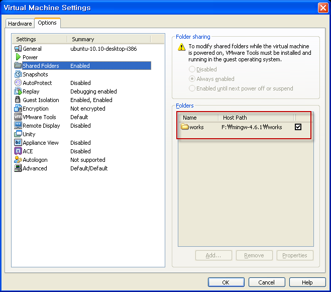 Settings -> Options tab -> Shared Folders 선택후..