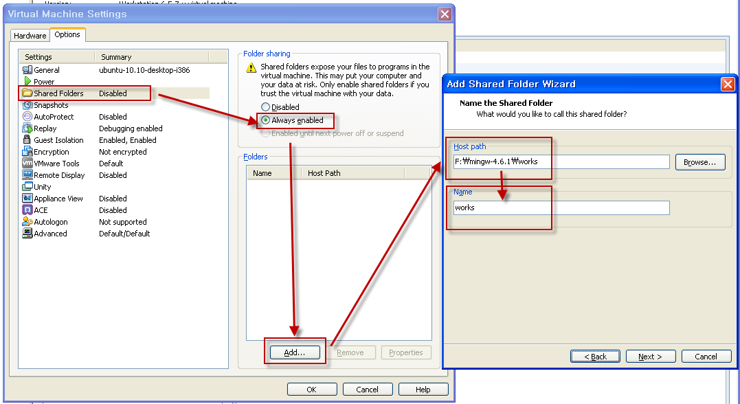 guest os로 우분투가 있고 윈도우즈의 폴더에 r/w 접근하고자 할때 아래와 같이함.