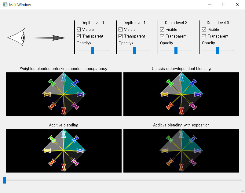 OpenGL의 투명 기법중의 하나인 Weighted blended order-independent transparency 을 구현한 예제 코드.