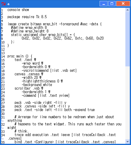 아래의 스크립트는 텍스트 위젯에 라인넘버 기능을 넣고, wrap 된 라인에 wrap이미지를 보여주는 스크립트입니다. 간단한 텍스트 편집기를 만들고자 하시는 분들께 도움이 되리라 생각이 듭니다.