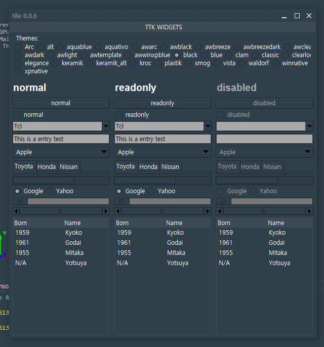 Qt의 윈도우에 Tk toplevel을 내장시켜 보았음. Qt의 윈도우는 frameless 타입으로 세팅해서 사용 중이고, 내부 위젯으로 toplevel 대신에 *toplevel 커맨드를 만들어서 Tk의 toplevel을 내장시켜서 사용 중.