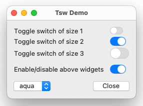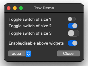 Tsw는 Toggle switch(토글 스위치)의 약자로, Tcl/Tk 8.6 이상 버전에서 사용할 수 있는 확장 패키지입니다. 만약 Tcl/Tk 버전이 8.6이라면, 추가로 tksvg 확장 패키지가 필요합니다. (Tk 8.7 및 9.0 이상 버전에서는 SVG 지원이 내장되어 있습니다). 이 패키지는 순수 Tcl/Tk 코드로 작성되었으며 다음을 포함합니다: