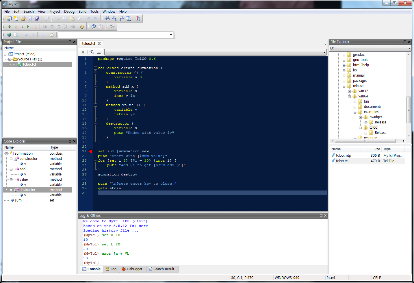 MyTcl is an IDE which includes the convenient code editor, the debugger, and the latest Tcl/Tk interpreter. Comparing to the ActiveTcl, MyTcl provides the entirely different environment. You can use every functions of Tcl/Tk just by using MyTcl.