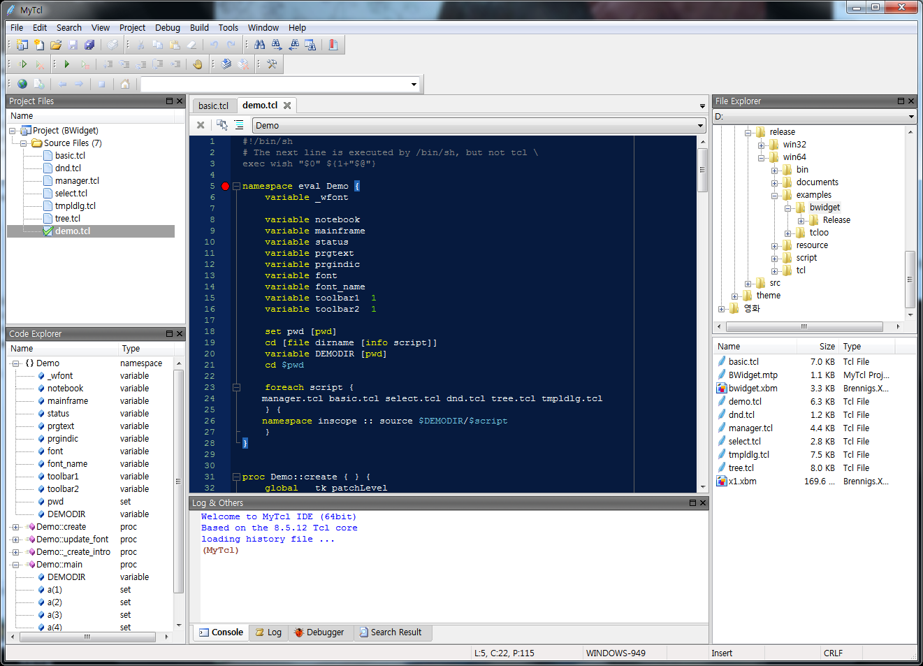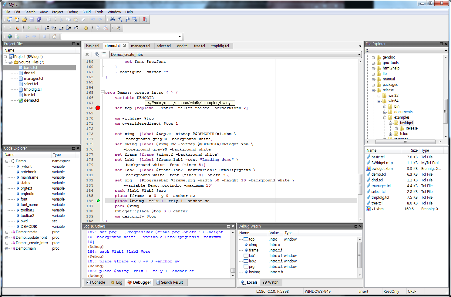 MyTcl provides a differentiated debugging function comparing to other Tcl/Tk IDEs. After setting a break point, you can trace or change the value of a variable with moving just one line at a time by pushing a debugging button. Besides this function, MyTcl also provides Go Step Into Step Out Step Over Run To Cursor Stop Abort functions like other IEDs. When you drag the variable on the Watch Variable window, moreover, you can conveniently debug your codes. On Watch Variable window, it is supported to see the local variables and variable types.