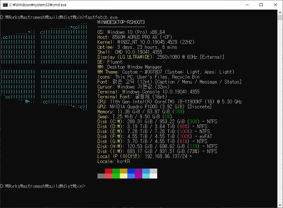 fastfetch는 시스템 정보를 가져와서 보기 좋게 표시하는 프로그램. 주로 성능과 사용자 정의 기능을 염두에 두어 C로 작성되었다고 함. 현재 Linux, Android, FreeBSD, macOS, SunOS 및 Windows 7+가 지원.. 따로 시스템 정보 가져오는 코드를 작성하지 말고.. json 포맷으로도 export 가능하니 이거 불러다 쓰면 좋을 것 같음.