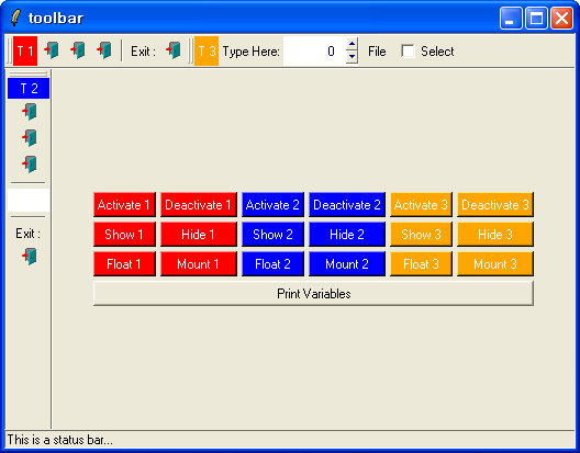 Tk Toolbar 는 tk용 툴바 위젯을 구현하는 Tk 전용 확장 프로그램입니다. 생성된 툴바는 호스트 창의 네 면으로 이동할 수 있으며, 호스트 창에서 플로팅 창으로 분리할 수도 있습니다. 위젯, 도구 설명 및 상태 표시줄 지원(상태 표시줄 역할을 하는 위젯에 도구 설명 메시지를 배치)을 포함하는 기능이 포함되어 있습니다.