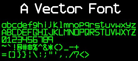 VectorFont::DrawString .c {10 100} "abcdefghijklmnopqrstuvwxyz\nABCDEFGHIJKLMNOPQRSTUVWXYZ\n0123456789\n~`!@\#\$%^&*\(\)_-+\n=\[\]\}\}|\\:;\"',./?<>" 3.2 -fill green -width 2