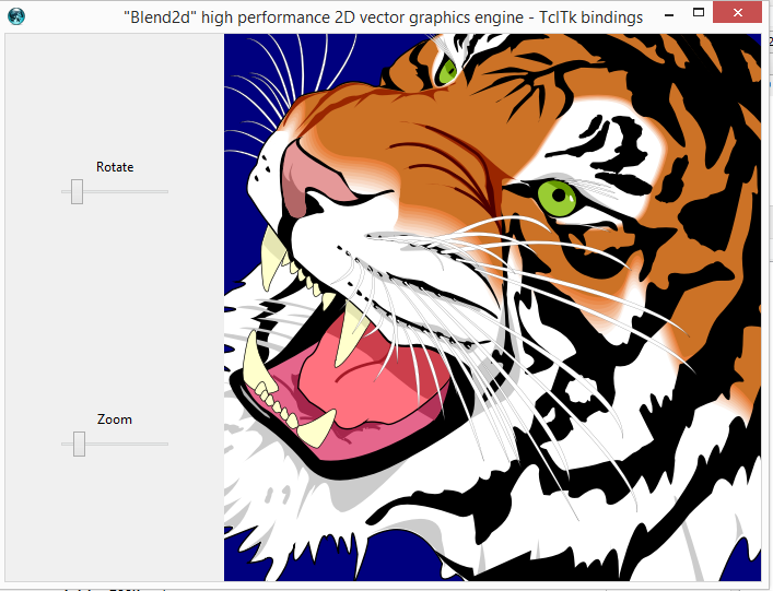 TclBlend2d is a Tcl package for working with the Blend2d graphics engine. Blend2d is an open source, high quality, high-performance vector graphics engine. TclBlend2d is a multiplatform binary package including Blend2d library for Windows and Linux; MacOS support is planned. Images created with TclBlend2d can be saved as BMP files, or exchanged with the tk-photo images. TclBlend2s provides also a new type of tk-image (named "blend2d") you can embed in your widgets much like a tk-photo image. You can draw on a "blend2d" tk-image and instantly see the changes in the widgets that have this image attached. TclBlend2d closely matches the Blend2d C++ API with the exception of cases where a more Tcl-ish way is more appropriate.
