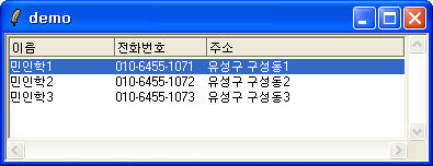 .listbox insert end { 민인학1 010-6455-1071 "유성구 구성동1"}