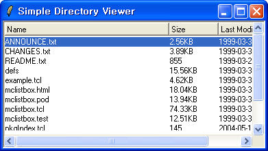 아래의 그림은 mclistbox에 포함되어 있는 예제(sample.tcl)로, Name, Size Last Modified의 항목으로 정렬하는 예제입니다.