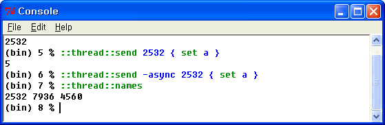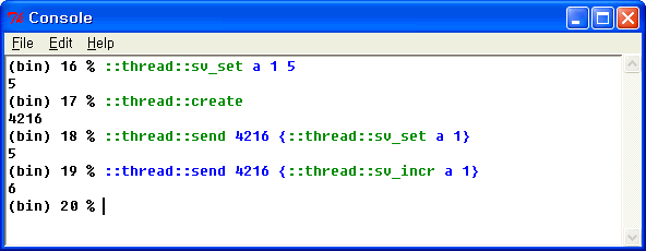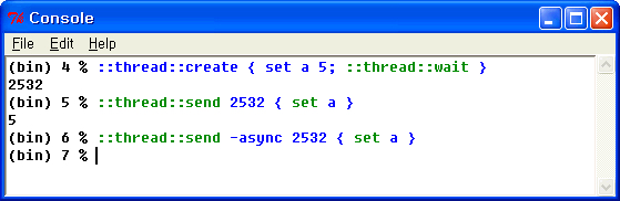 다른 쓰레드에서 대기상태의 쓰레드에 send 커맨드로 스크립트를 송/수신할 수 있습니다. send 커맨드의 인자에는 송신지의 쓰레드의 쓰레드 ID와 스크립트를 지정합니다. 보통 send 커맨드로 송신한 스크립트의 결과는 동기화로 반환됩니다. send에 -async 옵션을 준다면 비동기로 처리되며, 코드의 실행 결과는 반환하지 않습니다.