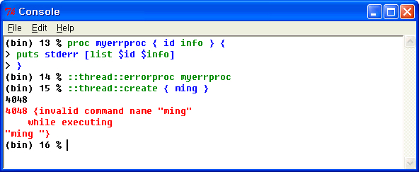 create 커맨드로 생성된 쓰레드에 실행 중인 스크립트 에러가 발생하고, 또한 그 에러를 catch로 감싸지 않으면 애플리케이션의 이상종료가 발생됩니다. 쓰레드 내부에서 발생한 에러는 errorproc로 에러 원인을 얻을 수 있습니다. 에러 프러시저를 정의해 두면 애플리케이션의 이상종료를 막을 수 있습니다.