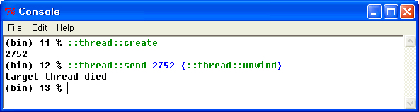 쓰레드를 삭제시 exit나 unwind 커맨드를 사용합니다. (Thread 2.2부터는 ::thread::exit에서 ::thread::unwind로 변경되었습니다.)