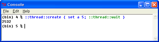인자에 스크립트를 지정하면 생성된 쓰레드로 스크립트를 실행합니다. 또한 스크립트의 실행이 끝나면 쓰레드가 자동적으로 삭제됩니다. 스크립트의 실행이 끝난 후에 쓰레드의 삭제를 막고 싶다면 쓰레드를 이벤트대기 상태로 해둡니다. 이때 vwait를 사용해도 되지만, wait커맨드도 사용할 수 있습니다.