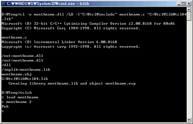 cl -o monthname.dll /LD -I"C:\tcl\include" monthname.c "C:\tcl\lib\tcl84.lib"