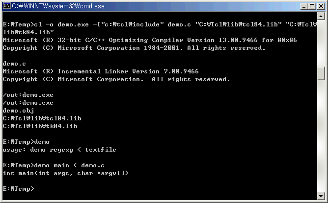 cl -o demo.exe -I"C:\Tcl\include" demo.c "C:\Tcl\lib\tcl84.lib" "C:\Tcl\lib\tk84.lib"