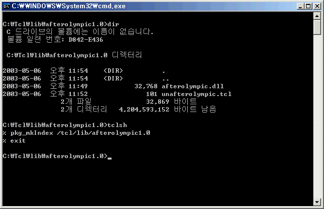 그럼 이제 디렉토리 하나를 만들고 그곳에 C로 작성한 확장 라이브러리와 Tcl로 작성한 확장 라이브러리를 복사합니다. 디렉토리는 Tcl이 설치된 lib에 패키지 이름-버전으로 만듭니다. 이것이 보통 패키지가 있는 디렉토리의 네이밍 룰(rule)입니다.
