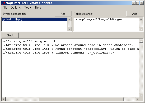 Nagelfar은 100% 순수 Tcl로 기술된 Tcl 문법 체크 프로그램으로 아래의 특징을 갖습니다.
