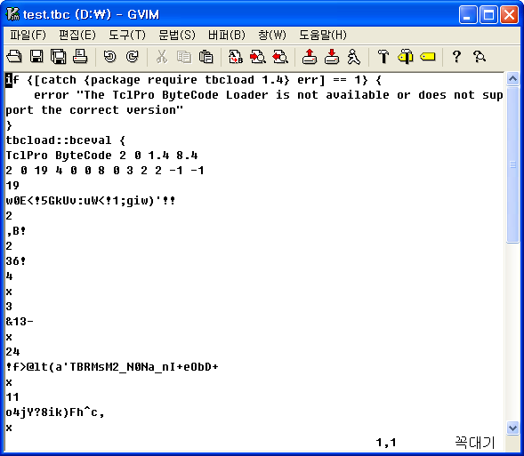 이것으로 바이트 코드로 컴파일된 test.tbc 파일이 생성됩니다. 이 tbc 파일을 수행하기 위해서는 tbcload 확장 패키지가 필요하지만, ActiveTcl에는 기본으로 포함이 되어 있어 다음과 같이 실행하기만 하면 그만입니다.