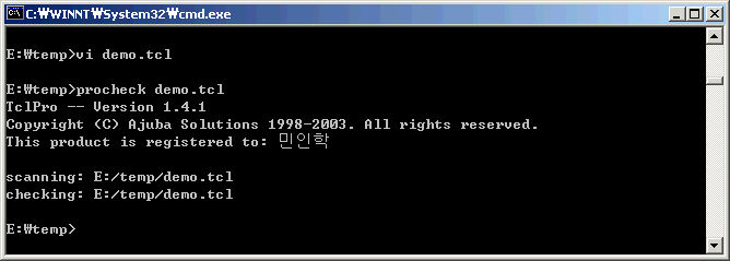 체커는 도스창에서 사용을 합니다. procheck 커맨드의 인자에 Tcl스크립트를 주면, 표준출력으로 결과가 표시됩니다.