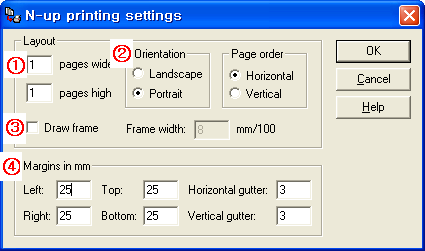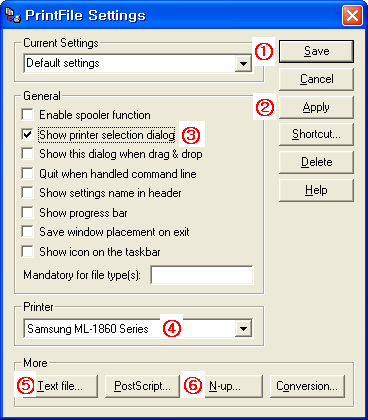 위 화면은 “Settings…” 버튼을 눌렀을 때 나타나는 화면입니다. 몇 가지만 차례대로 설명하겠습니다. (1) 설정한 값을 저장합니다. (2) 설정한 값을 저장하지 않고 적용합니다. (3) 프린터를 선택하는 “인쇄” 창을 나타나게 할지의 여부를 선택합니다.