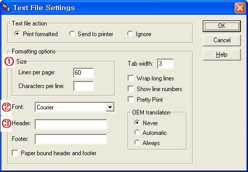 텍스트파일 관련 옵션을 조정하기 위한 화면입니다. (1) 글자의 크기를 정합니다. 한 페이지에 몇 행이 들어갈 것인가를 입력하면 글자의 크기가 정해집니다. 50 내지 70 정도가 적절할 것입니다. 인쇄해 보시고 정하시면 되겠습니다. 한 행당 글자수를 입력하는 칸이 있는데 필자는 공란으로 두었습니다. (2) 폰트를 선택합니다. (3) 헤더와 푸터를 입력합니다. 페이지 아래의 중앙에 “- 1 – “ 이렇게 페이지 번호를 달려면 Footer 칸에 “&c- &# -“을 입력합니다. &c는 중앙을 의미하고 &#는 페이지 번호를 의미합니다. 더 자세한 것은 도움말 파일을 참조하십시오.