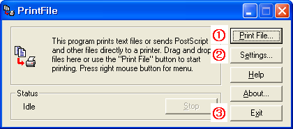 위 화면이 프로그램의 주화면입니다. 메뉴에 대해 간략하게 설명하겠습니다. (1) 파일을 출력합니다. 이 버튼을 누르면 파일선택 창이 나오고 선택하면 출력이 시작됩니다. (2) 폰트나 여백 등의 옵션을 조정합니다. (3) 프로그램을 마칩니다.
