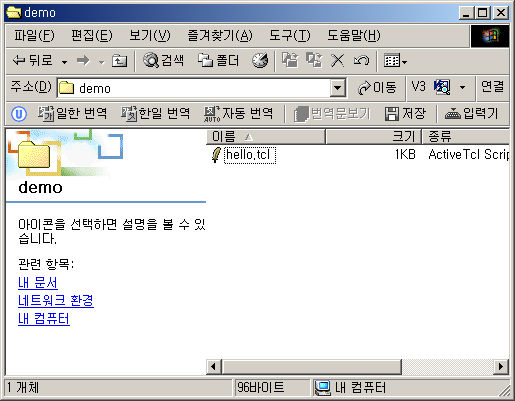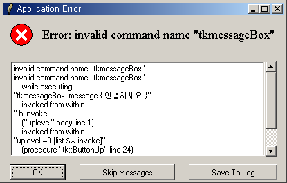 어떻습니까? 간단하죠? -command는 버튼이 클릭되면... 이라고 하는 의미이고, tk_messageBox는 메시지박스를 출력하는 커맨드입니다. 참고로, wish보다 기능이 많은 TkCon이라는 콘솔도 있습니다. 히스토리 트리기능이나 로그의 보존 기능등이 편리하더군요.