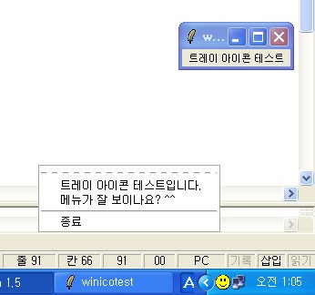 아래 그림은 위 코드의 실행결과입니다. 스마일 아이콘을 왼쪽 버튼으로 클릭하면 창이 활성화 되고, 왼쪽 버튼을 누르면 아래와 같이 메뉴가 나타납니다.