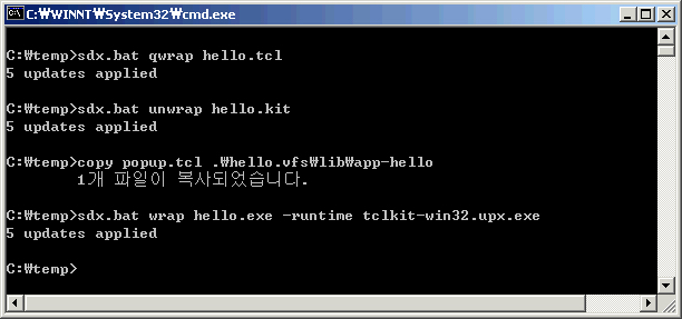 hello 메시지가 출력됩니다. 이상 Tcl/Tk로 만든 프로그램을 독립적인 실행파일로 만드는 방법에 대해서 알아보았습니다. 이제 여러분은 hello.exe 파일 하나만 배포하면 됩니다.