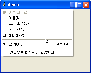 시스템 메뉴는 타이틀바의 왼쪽에 작은 아이콘을 클릭하면 표시되는 메뉴입니다. Alt + Space 키로도 열립니다. 시스템 메뉴는 특수한 패스를 사용합니다. (윈도우즈만 해당)