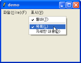 .menu.view.menu add radiobutton -label {목록(L)} -underline 3 -value 1 -variable view