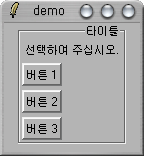 label과 frame의 조합에 많은 분들이 목말라 했을겁니다. 다른 GUI 툴킷에서는 훌륭한 메이저 위젯으로, Tk에서도 사용할 수 있게 됐으며, frame의 선 일부에 label을 표시할 수 있습니다. 텍스트는 -text 옵션으로 지정할수 있고, -labelwidget 옵션으로는 임의의 위젯을 지정할 수 있습니다. -borderwidth와 -relief등 frame위젯에서 사용하던 옵션의 대부분을 사용할 수 있습니다. 독특한 옵션 -labelanchor는, frame위의 label 위치를 동남서북 eswn의 기호로 나타내고, 최대 2개의 조합으로 사용할수 있습니다. 기본은 nw(북서: 왼쪽 위)입니다.