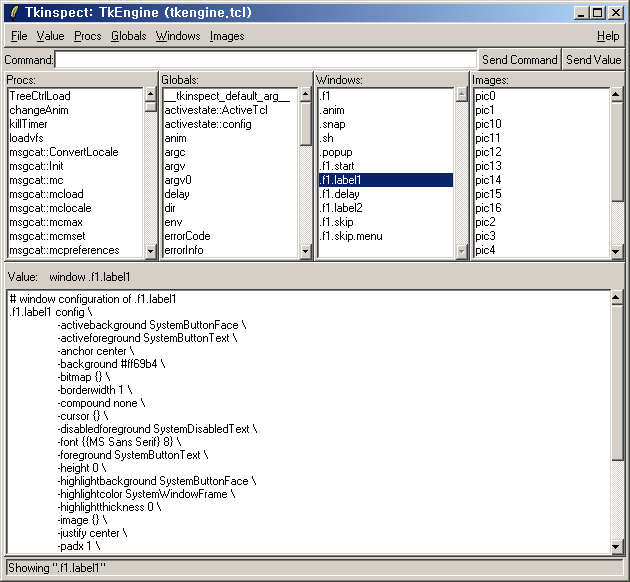Command:에 커맨드를 입력하고, Send Command 버튼을 누름으로서 Tk 애플리케이션에 커맨드를 송신하고 실행할 수 있습니다. 커맨드의 결과는 Value 윈도우에 표시됩니다. Globals 리스트에서 변수를 선택하고, Value 윈도우에서 그 변수값을 변경한 후에, Send Value 버튼을 누름으로써 변수값을 변경할 수 있습니다. Globals 메뉴의 Trace Variable를 선택한다면 변수를 추적할 수 있는 윈도우가 보이며, 변수값의 변화를 실시간으로 추적하여 보여줍니다.