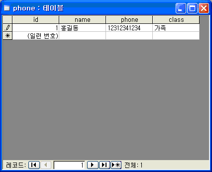 이제 자료를 입력할 차례입니다. 데이터베이스 창에서 "phone" 테이블을 더블클릭하여 자료입력을 위한 창을 엽니다.